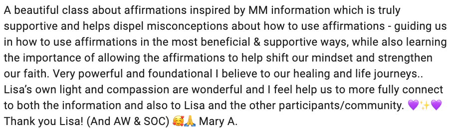 Affirmations are a part of the MM Healing Path, the free course on the MM website. Lisa carries that wisdom into her work. Lisa is a true MM follower and very gifted at what she does. —Mandi Palmer, Intuitive Health Strategist